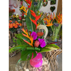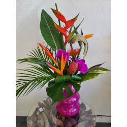 Bouquet composé d'un gros Héliconia, 1 oiseau du paradis, petits héliconias tropic, protéa, nutan, fleurons de phalenopsis roses, Feuille de strélizia séchée. Feuillages luxuriants. Attention, selon les arrivages, quelques fleurs peuvent être modifiées avec une fleurs de même valeur.