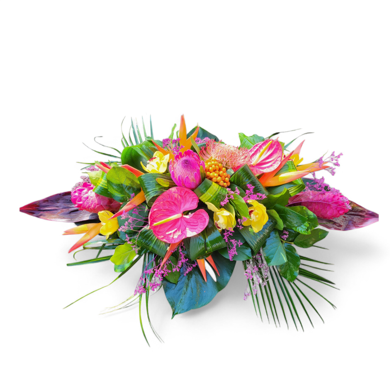 Cette composition est travaillée de manière allongée. Dimension environ 90 cm de long sur 35/40 cm de large. Coloris multicolores avec alpinia, orchidées, petits héliconias, protéa, anthurium, limonium.... Attention, comme toutes nos compositions florales, quelques fleurs peuvent être différentes en fonction de nos arrivages.